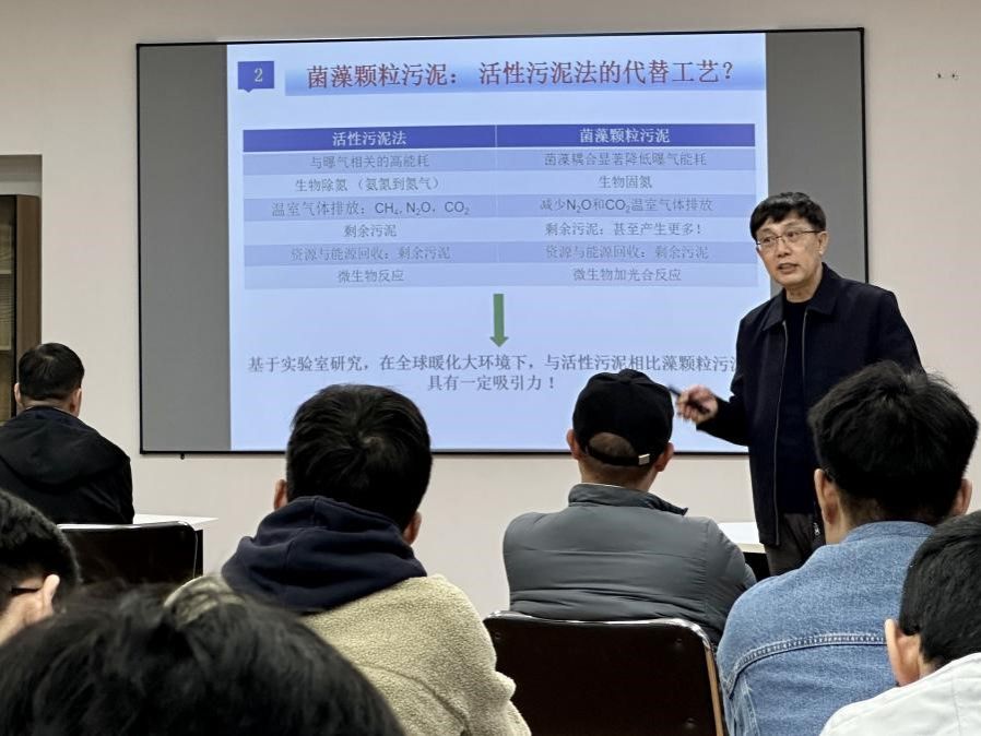 对于菌藻颗粒工程化需要解决的问题,刘雨教授指出了未来的发展方向。讲座结束后,师生踊跃发言,刘雨教授耐心细致地回答了参会师生提出的问题。最后,刘雨教授勉励同学们要理论与实践相结合,为水处理事业贡献自己的力量。