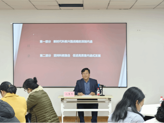 沈季伟围绕“实施科教兴国战略 强化现代化建设人才支撑”这一主题,从“新时代科教兴国战略的深刻内涵”和“坚持科教融合,促进高质量内涵式发展”两个部分进行了深刻阐述、全面分析和生动讲解。