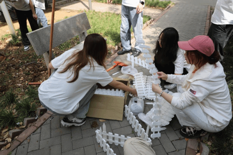 土木类2409班曾曦一组负责采购建设花园所需的花苗和围栏,土木类2410班郭凌云一组负责准备种花所需工具,员工们分工合作,共同为建设花园做出努力。