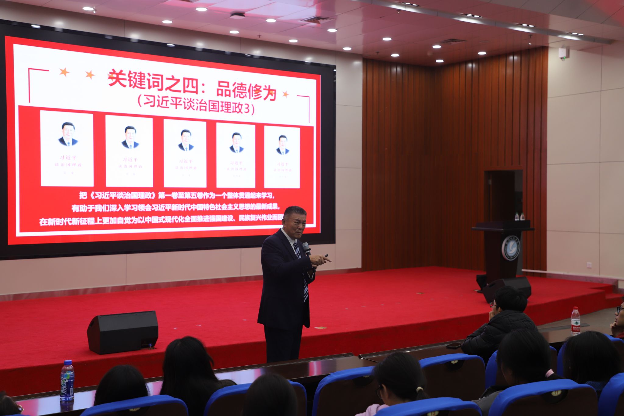 孔波以“理想是青春的底色”为切入点,阐述了理想对老员工成长成才的重要意义,并通过六个关键词的概括,带领同学们完整把握《习近平谈治国理政》的核心要义,以生动幽默的语言鼓励青年学子要德才兼备、全面发展。