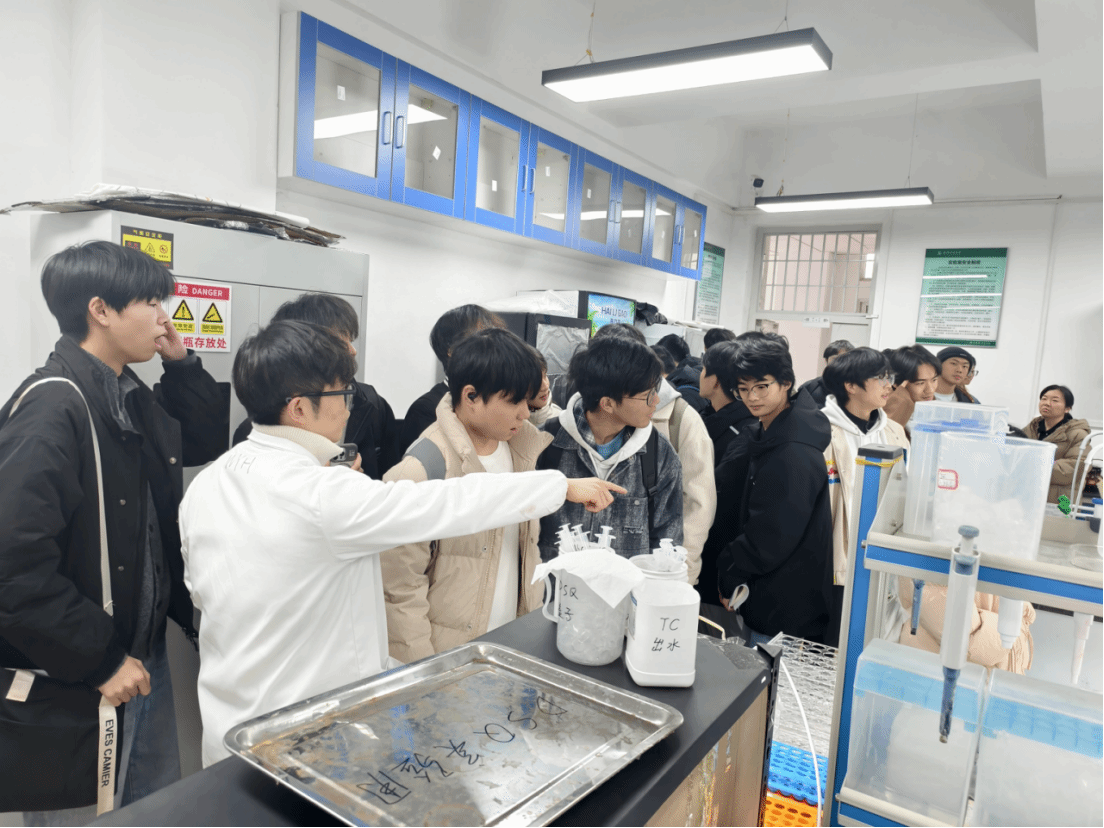 各位老师为同学们系统讲解了实验室的功能布局、主要设备及其在专业教学与科研中的重要作用。建环实验室展示了建筑节能、室内环境监测等平台,陈敏结合实际讲解了相关技术在绿色建筑与低碳发展中的应用,并指出部分实验室平台由员工捐赠搭建,承载着对母校的深情,彰显了员工反哺的优良传统,令同学们深受鼓舞。在给排水实验室,樊杰、邓佳讲解了水资源处理、管道系统和水质监测等环节,由相关专业研究生进行现场操作演示,通过理论与实践的生动结合,系统阐述了该学科在保障水安全、推动水资源循环利用方面所发挥的重要作用。